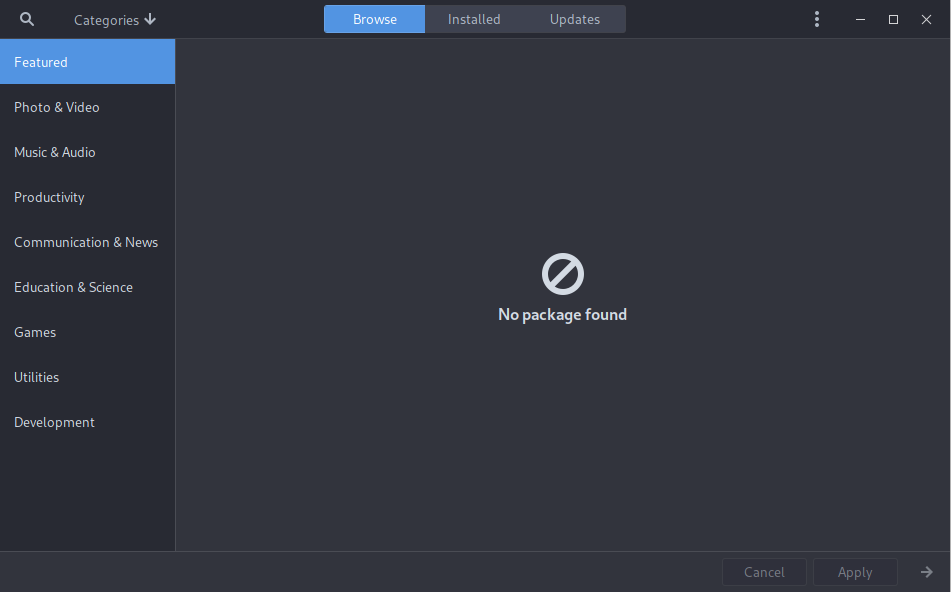 Installing software through the “Add/Remove Software” application is non-existant. I couldn’t find any software in any of the categories, although I can search for software with the search bar.