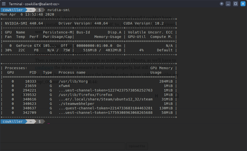 Now let’s talk about the NVIDIA drivers. You might recall I couldn’t have them installed through the installer itself. So, installing the NVIDIA drivers post-installation went like this: