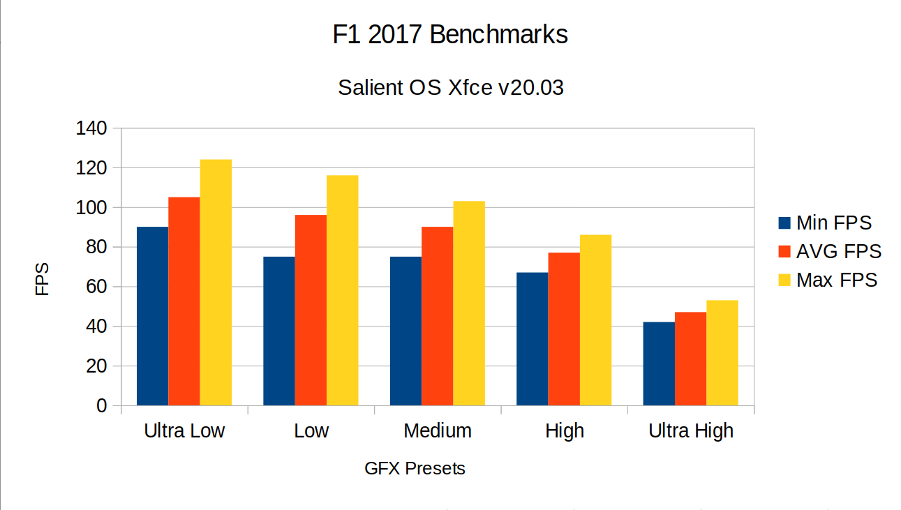 Now, what most of you readers out there are probably interested in most here, is how games perform in comparison to other distros. I took F1 2017 and ran some benchmarks. Bear in mind, I’m running these benchmarks with the following hardware/software:
