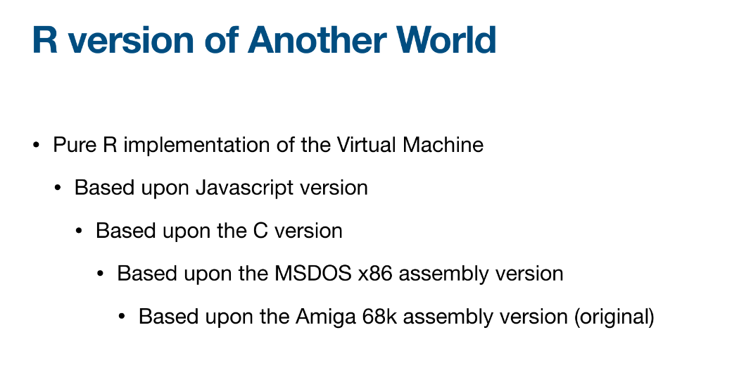 Making Another world run in R is not just a matter of having a fast graphics device. We are talking about a full port in the R language. It’s possible in R to use shorcuts and program some functions in C for higher speed, but the author insisted in using only R code to create this port.