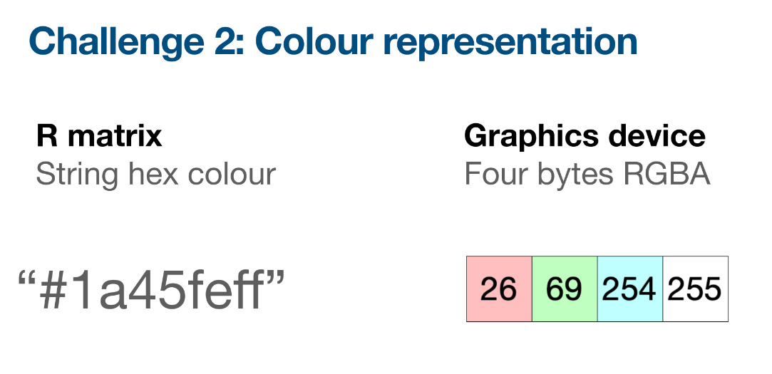 Another challenge is that the way color is typically encoded in R is using hexadecimal values. Graphics devices once again prefer to store RGB values in different values.