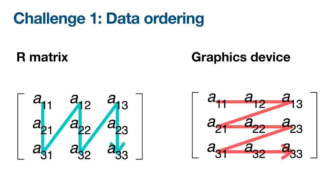 The problem with graphics operations in R is that typical data structures do not correspond well to what is used in graphics devices. For example, a matrix in R is organized from columns to rows, while graphics devices usually expect row to column ordering matrices.