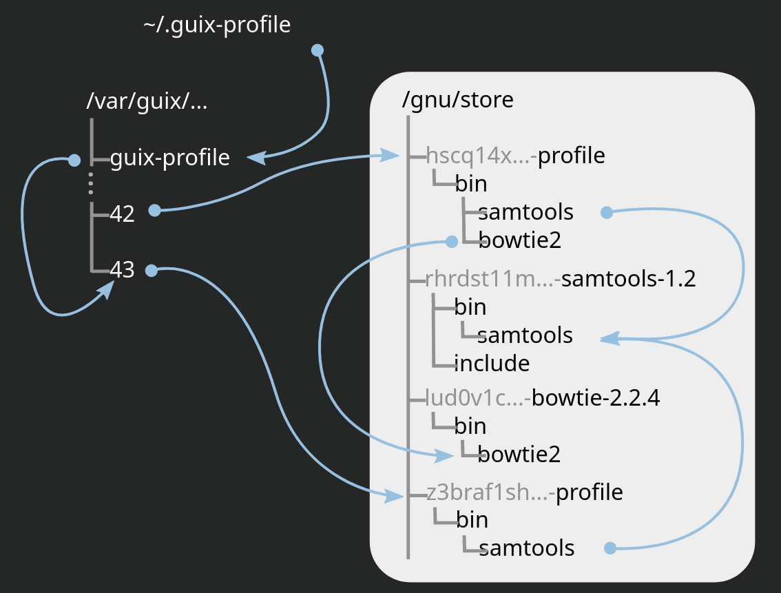 The above diagram shows how a Guix profile (what you have installed) and filesystem is built up, in this case for the /bin directory. Your user ~/.guix-profile is a symlink to a particular profile, where both older and newer ones may be available. In this case profile 42 has both bowtie2 and samtools installed, while profile 43 has removed bowtie2. However, the program still exists as another profile uses it, until all profiles that use it are deleted, allowing it to be garbage collected. You can see with multiple profiles using the same program it is not stored multiple times (it is deduplicated). To undo the removal of bowtie2 it is as simple as changing the profile to point back to the previous one, doing a roll-back. This set of symlinks is how bin is built up, rather than something like /usr/bin being a giant folder everything installs into. Also, only the bin folder of what you wanted will be added, any intermediate binaries (from dependencies) typically aren’t included, keeping it cleaner and only what you requested. (The program can access dependencies in the store to run, without polluting your user environment.)