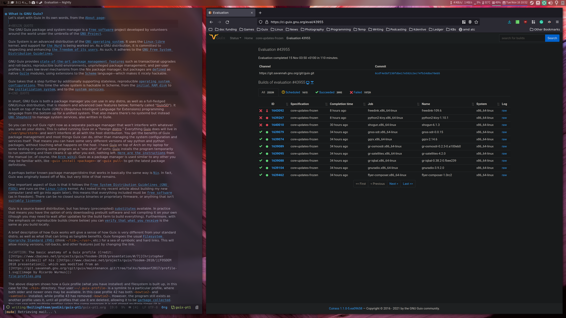 While waiting to put together my new desktop build, I spent some time learning a bit about Guix and trying it out to see if it could at least cover my basics. It did, and the work it required from me was fun, leading to me getting involved with the project itself (albeit with some minor contributions so far). I frequently check in on the IRC channel, browse recent issues, and look at the mailing lists.