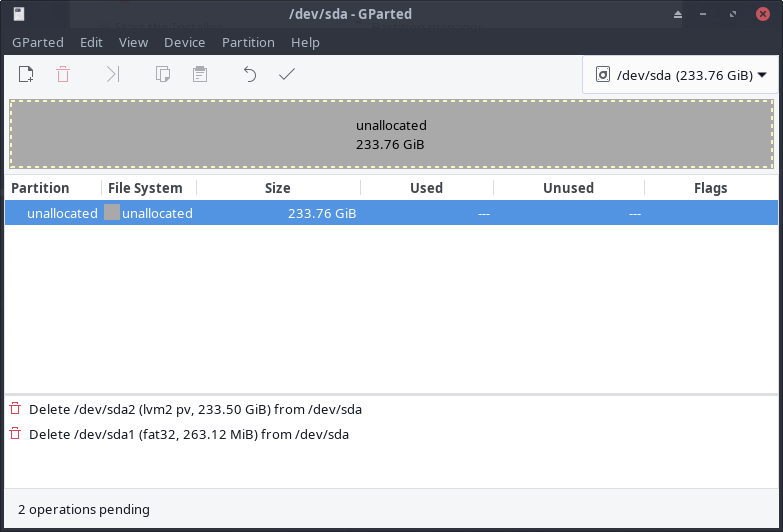 You need to select the SSD (sda). Then delete the partitions in there until you see a single unallocated. End by confirming the changes.