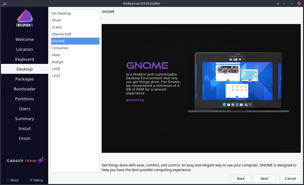 Some distributions offer an ISO per desktop environment, as in the case of Manjaro. For EndeavourOS it is a single ISO and you select your desktop environment during the installation, if you have internet; otherwise you will install XFCE as your DE.