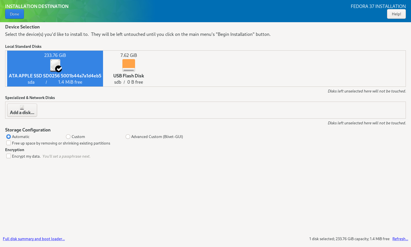 - On Installation Destination, make sure that your ATA Apple SSD is selected and storage configuration is Automatic. Click Done.