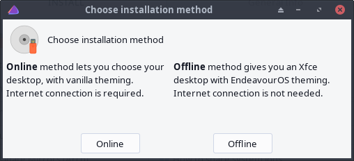 For EndeavourOS, you might be able to use Wi-Fi, and also select what Desktop Environment to use if you choose the Online