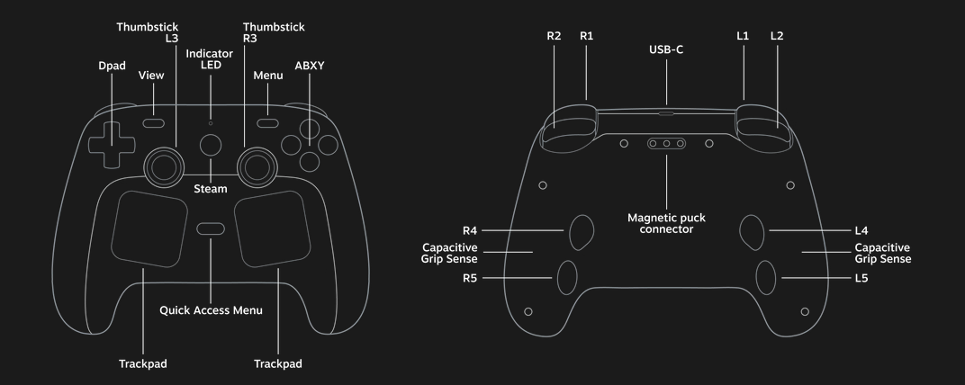 Steam Controller looks like a better Dual Sense. With gyro, nice placed magnetic thumbsticks (TMR) and trackpads on a sweet reachable spot. It has the same inputs as your Steam Deck (with 4 grip buttons at the back), with configurable grip sensors.