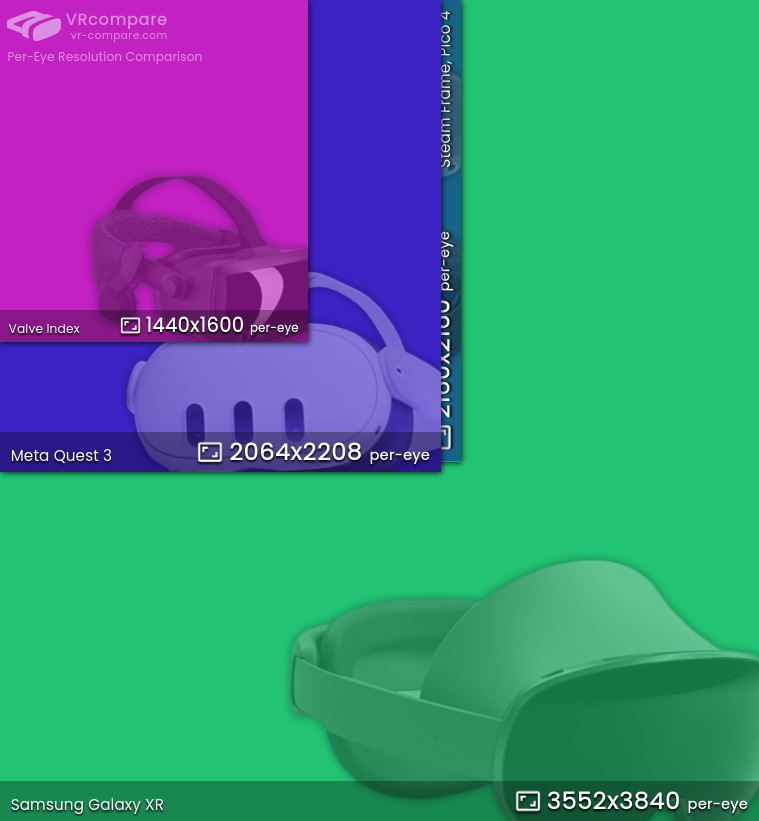 | Resolution | 2064x2208 per-eye | 3552x3840 per-eye resolution | 2160x2160 per-eye | 2160x2160 per-eye | 1440x1600 per-eye | |